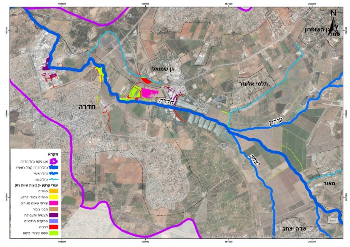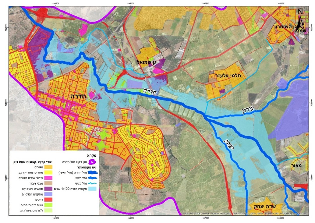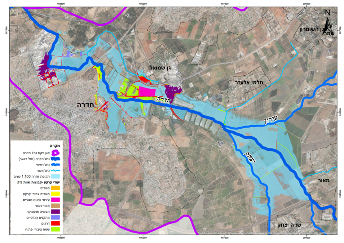 כתום – שטח ייעוד הקרקע במ"ר – בנפרד לפי עומק הצפה של מתחת ומעל 0.5 מ'.